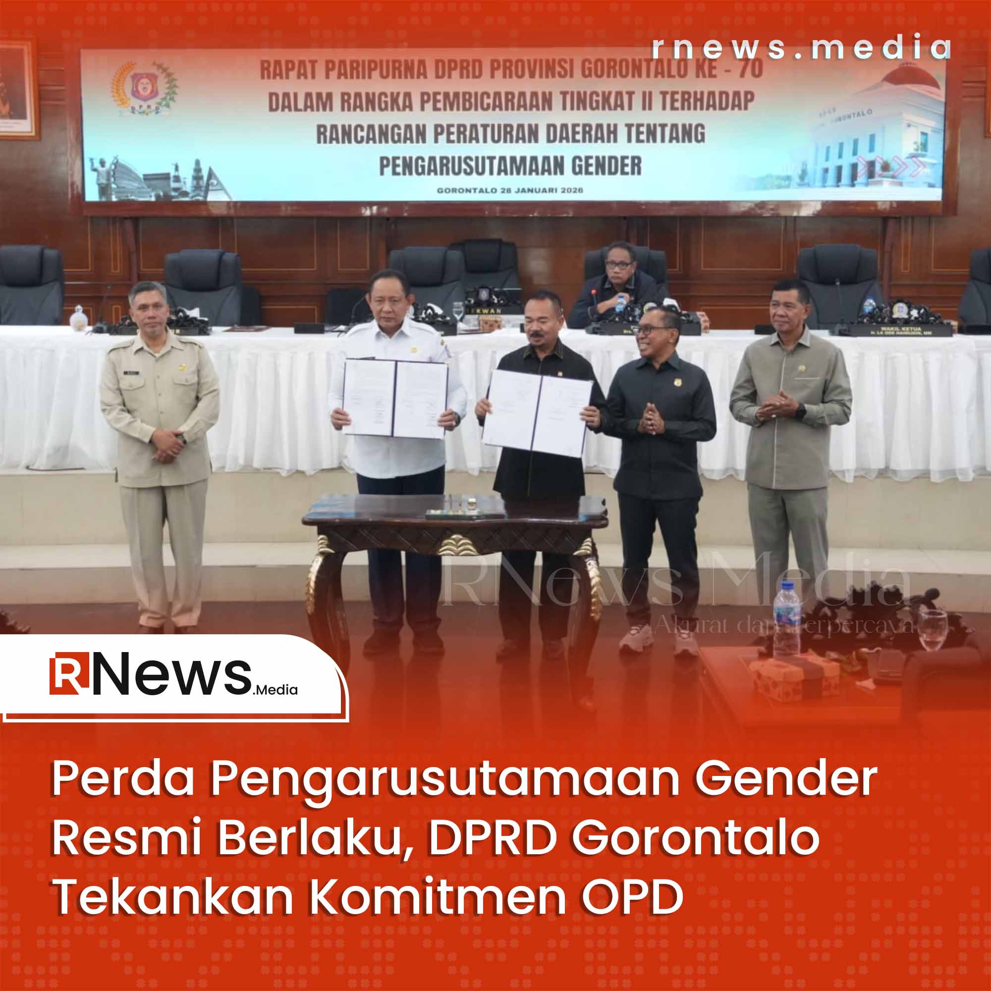 DPRD Provinsi Gorontalo bersama Pemerintah Provinsi Gorontalo menetapkan Peraturan Daerah (Perda) tentang Pengarusutamaan Gender (PUG) dalam rapat paripurna, Rabu, 28/1/2026. Perda ini menjadi dasar untuk mendorong pembangunan daerah yang adil, inklusif, dan responsif terhadap kebutuhan perempuan dan laki-laki.